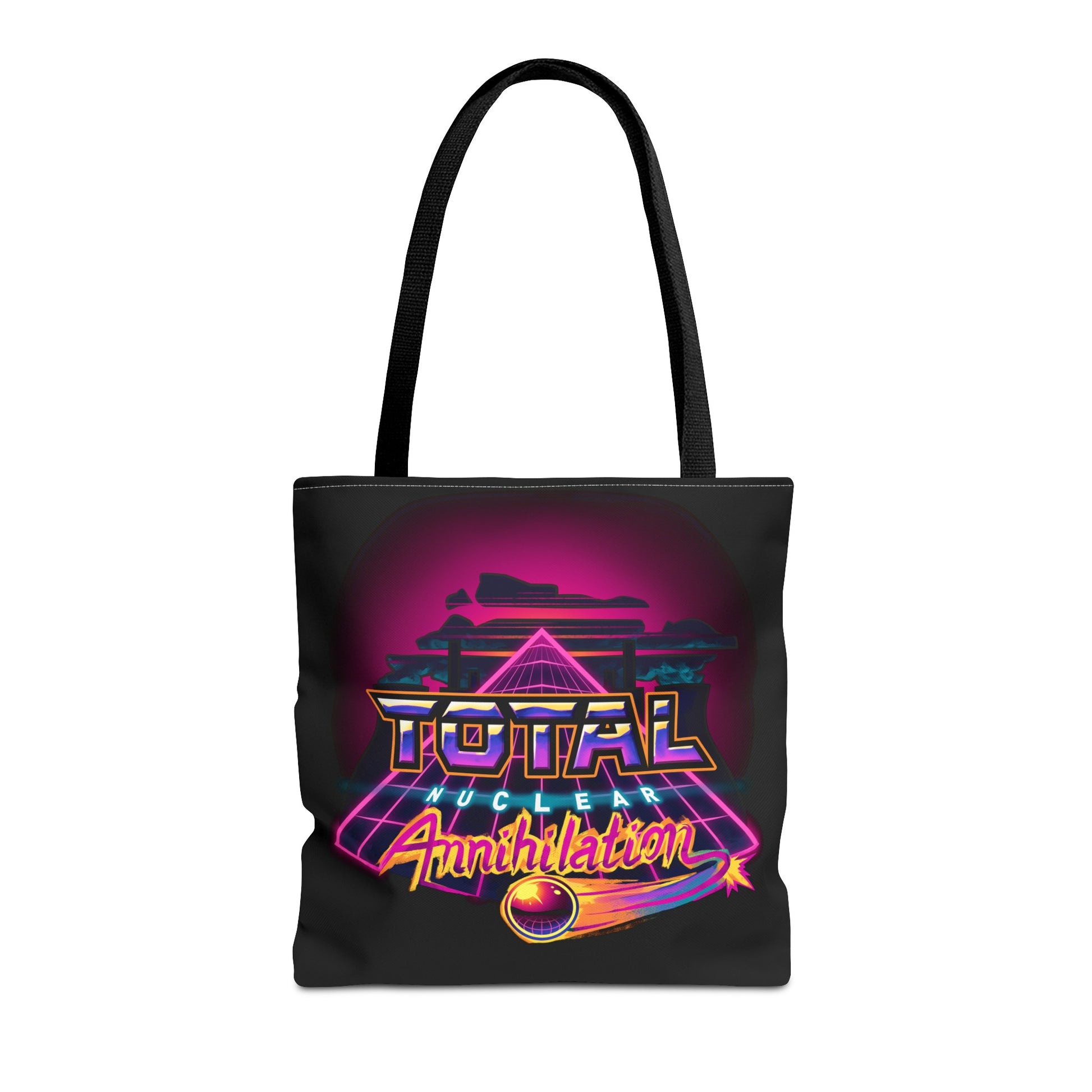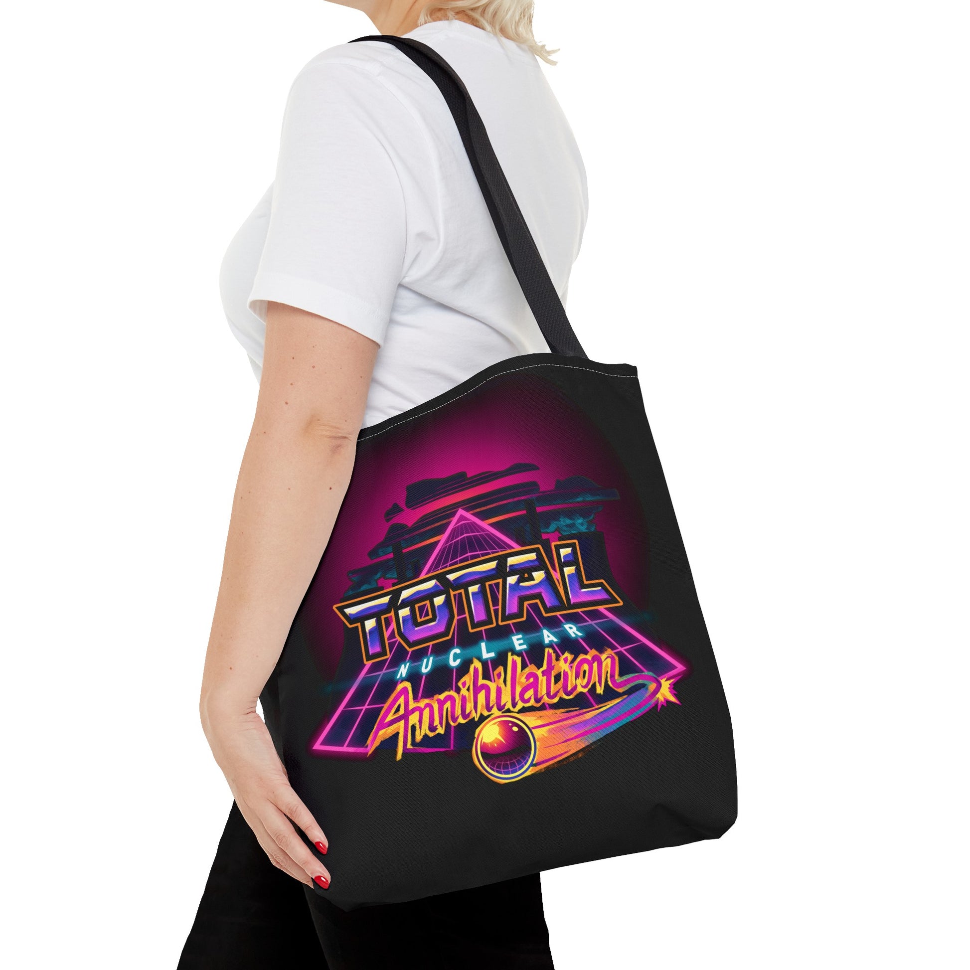 This Total Nuclear Annihilation pinball tote bag is 16" x 16", which is large enough for a gas mask, small geiger counter, and some iodine pills. Perfect for pinball shows!