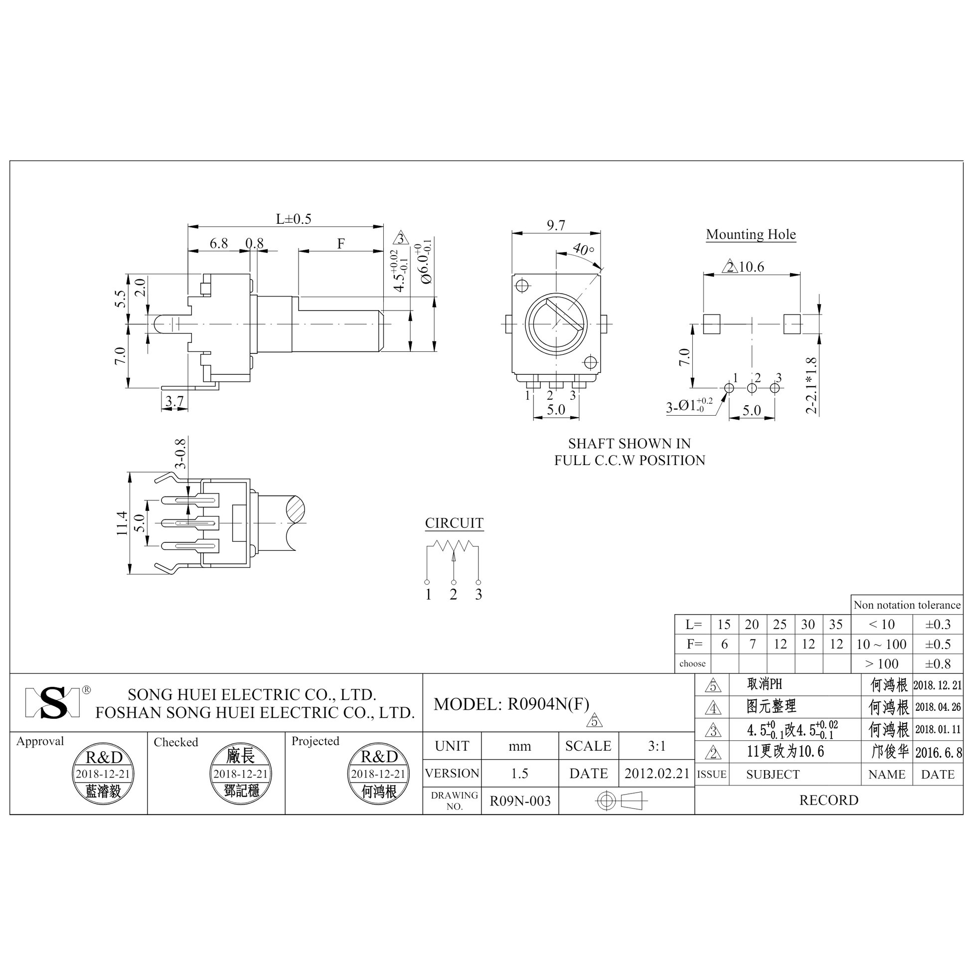 Song Huei 9mm Plastic Shaft Potentiometer L20 B10k